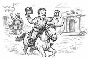 „Banka byla vzdálená asi dva kilometry, trochu dál, než chodíte do školy. Počkal jsem si v bance na vyřízení diskety, to bylo asi deset minut.“ Děti zakoulely očima nad nekonečností času obyčejného zaplacení. „V bance mi řekli, zda příkaz prošel, nebo neprošel a já šel zpátky do fabriky. Cestou zpátky jsem si dal pivo. Byla to pohoda.“ Děti chroustaly večeři a já chtěl dodat důležitost svému tehdejšímu úkolu. „A nemyslete si, tenkrát měla fabrika asi tři tisíce zaměstnanců. Vyráběli jsme nápravy pro auta do celýho světa. Takže v tom bankovním příkazu byly určitě milióny, spíš desítky miliónů, možná stovky miliónů korun.“