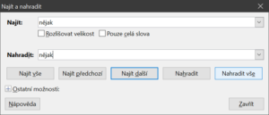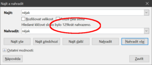 Velmi snadno zjistíme, jak to s tím kterým slůvkem je. Použijeme v editoru příkaz nahradit a prostě nahradíme podezřelé slůvko tím samým. Zase to předvedu na příkladu. Právě jsem odevzdal do Mystery Press finální vydání Měsíce mého života, román doplněný o pět povídek. Zadám do nahradit slovo nějak a uvidíme, co se stane: