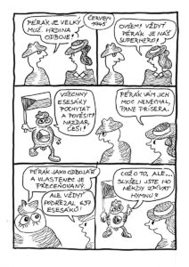 Pérák mi v jistém smyslu prolíná do přítomnosti – to když paní redaktora (ukáže se, že se jmenuje Slámová a je z Hané) vyptává Péráka na jeho činy za války. Občas ale se prolnu do přelomové doby, kdy válka skončila a začínal nový režim. Ne, Pérák není a nebude politická agitka. Některým otázkám se ale vyhnout nedá. Jaký by byl Pérákův osud, kdyby to byla skutečná figura? Otázka je to  absurdní, jelikož pérák je absurdní figura, ale i na absurdní otázky hledejme odpovědi. Neznám je. Hraju si s možnostmi. Pérákův protihráč je generál Sturm a jeho esesáci, ale taky udavač Prisera. Ten by jistě nezůstal v přelomové době stranou.
