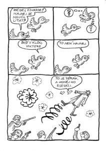 Ve vývoji mého cyklu má tento díl velký význam. Nastupují do něho dvě důležité figury, kačeři Edvard a Viktor. To jsou v jistém smyslu NPC, Non Playng Characters – ve válce, ve sporu Péráka a esesáků. Jsou to kačeři, ptáci. Mají své zájmy. Nicméně jejich sympatie je spíše na straně Péráka, ale zase ne tak moc, aby se strhali. Spíš to jsou pozorovatelé. Momentálně jsem už hodně daleko, zbývá mi čtyřicet příhod do konce. Kačeři Edvard a Viktor se objevují v každém desátém díle od čísla 150. Jsou mi sympa a těší mě o nich spřádat jejich epizody.