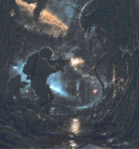 Tvor se pohne rychleji, než stihnu cokoliv říct. Jeden úder. Chitin versus člověk. Tělo narazí do stěny. Ticho.