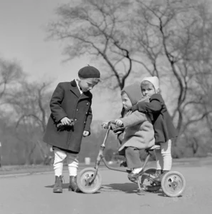 Důstojné dětské odění byly punčocháče. Měly barvu hnědavou, na zadku takový zvláštní oblý šev. Byly ve stylu unisex, bez ohledu na to, zda holčičí či klučičí, naprosto stejné! Pletené, myslím si. Jednou mi maminka koupila v Dětském domě (dodnes existuje) v Praze na Příkopě bílé punčocháče. Tehdy jsem se vzepřel a byl bych raději zemřel, než bych je oblékl. Zvítězil jsem tehdy. Snažil jsem se na webu najít dobový obrázek. Tady ten chlapeček má něco jako punčocháče,spíšto jsou pletené kamaše a hlavně, chybí ta správná barva. Pokud by někdo z laskavých čtenářů poskytl autentickou dokumentaci, rád doplním (mail: ondrejneff@gmail.com). Bylo by divné, kdyby se nezachovala fotografie tak zásadně rozšířeného kusu oděvu.